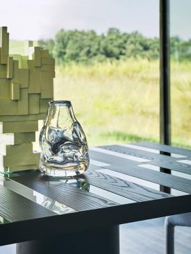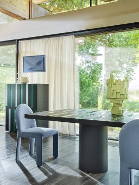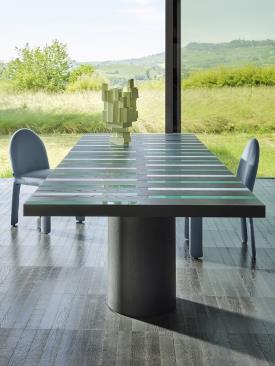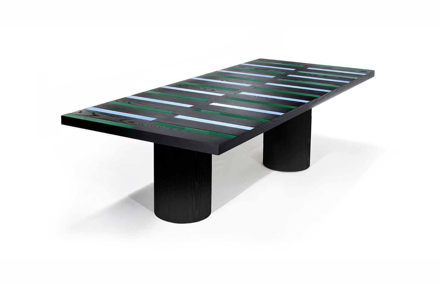Plateau en bois à âme alvéolaire, plaqué de frêne laqué à pores ouverts noir ou amarante. Inserts en verre laqué vert menthe et bleu ciel pour la version noire, ivoire et corail pour la version amarante. Pieds en contreplaqué cintré, plaqués de frêne laqué à pores ouverts noir ou amarante.